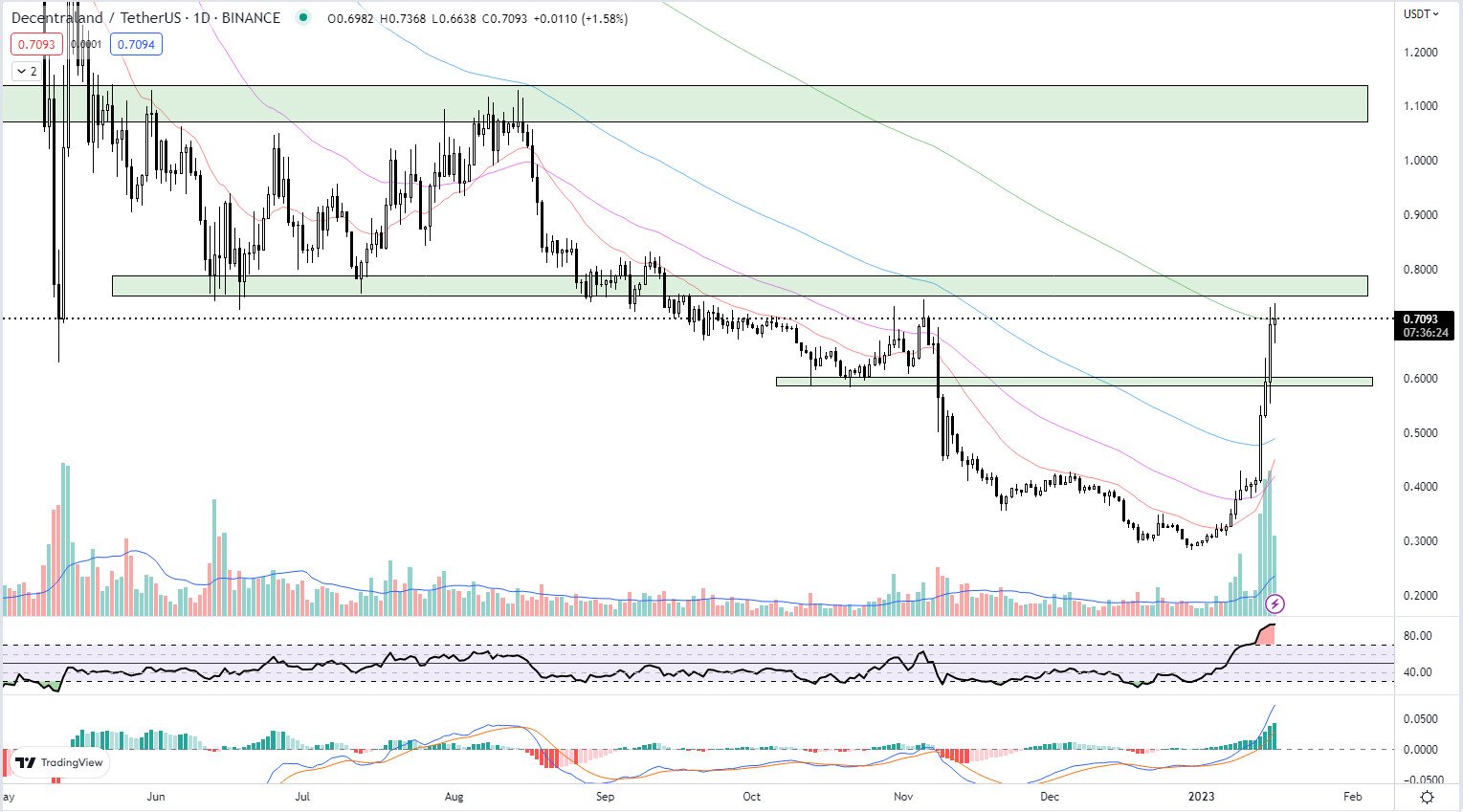 오늘(2023.02.02) 현재 디센트라랜드 시세는 US$0.810820이며, 24시간 거래대금은 US$259,050,899로 전 거래일 대비 10.2% 상승했습니다. 바이낸스 거래소에서 가장 활발하게 거래되는 화폐로 현재 유통량 18억개, 최대 유통량 2193226127.32015이며, FTX 관련 솔라나, 세럼 이후 폭발적인 상승세를 보이고 있는 NFT 화폐입니다.