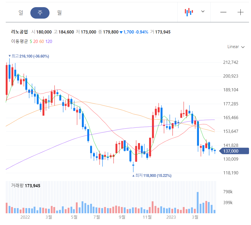 다만 아쉬운 점은 리노산업을 보면 주가가 추세에 동참하지 않았다는 점이다. 4월 18일 현재 리노산업의 주가는 고점 대비 약 1/3 하락한 137,000원이었다.