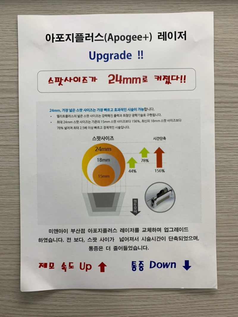 아포지 플러스 받았는데 쿨링 기능이 있어서 제모기로 촬영해도 선선한 바람 때문에 덥기보다는 따뜻한 느낌이 듭니다. 선생님이 아프냐고 물으시고 아프지 않으면 끝입니다. 사람마다 온도를 다르게 느낀다고 합니다. 가기 전에는 레이저 제모를 어떻게 하면 부끄러울까 항상 고민을 많이 했어요. 그런 분위기^^