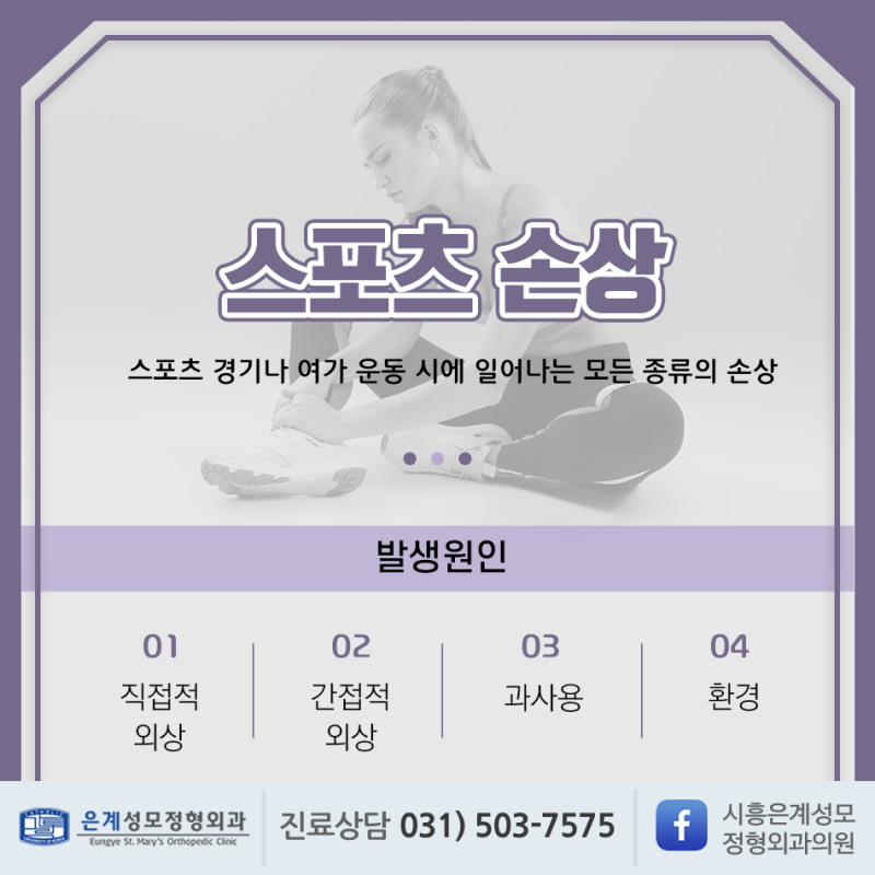 스포츠 부상의 원인을 살펴보면 각종 격렬한 운동을 하기 전에 준비운동을 하지 않거나 올바른 자세로 운동을 하지 않는 경우가 많습니다. 그리고 신체 능력 이상으로 무리한 운동을 하게 되면 스포츠 부상도 발생하게 됩니다.