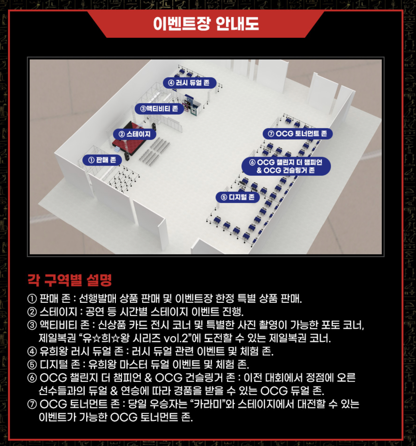- Activity Zone: 신제품 카드 전시 코너 및 특별한 사진을 찍을 수 있는 포토 코너. 유희왕 시리즈 vol.2 첫 복권에 도전할 수 있는 첫 복권 코너.