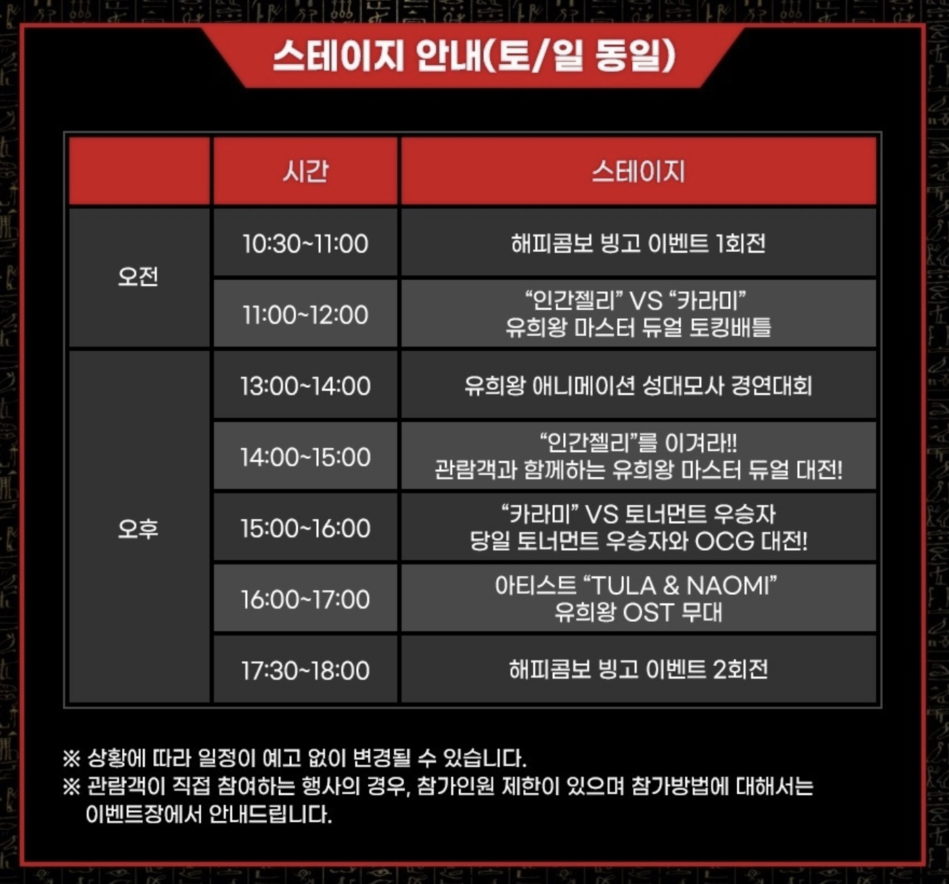 유희왕 축제 무대는 토요일과 일요일에도 같은 방식으로 열린다.