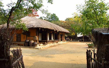 초가집 앞 정원에서