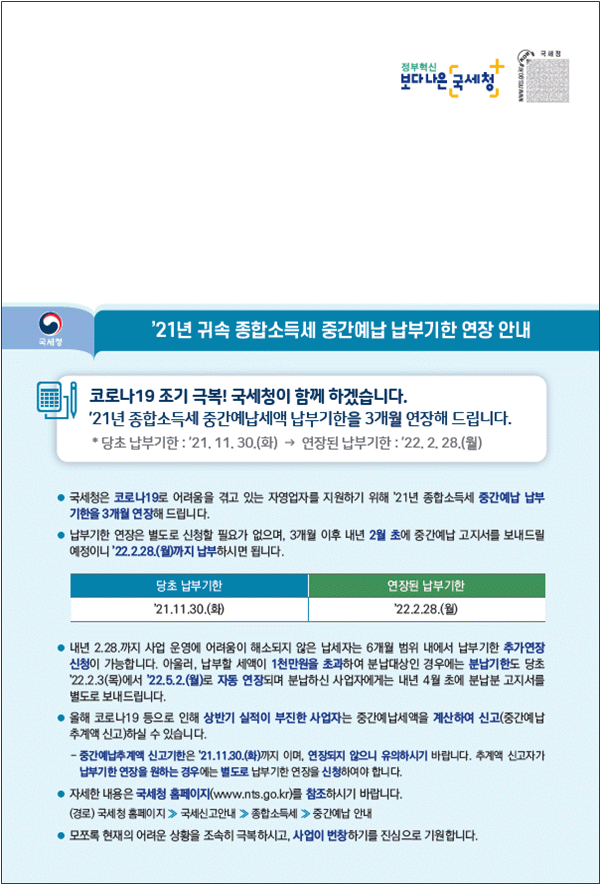 5월에 불로소득에 대한 종합소득세 신고·납부를 했다면 올해 11월 종합소득세 중간가지급금을 미리 납부해야 합니다. 2022년 종합소득세 조기납부기간 소득에 귀속되는 종합소득이 있는 개인사업자 140만 명. 국세청이 노인을 제외한 131만 명에게 종합소득세 중간예납고시를 발령하고, 2022년 11월 30일(수) 중간예납을 해야 한다고 사업자에게 알렸습니다! 다만, 다음의 조건에 해당하는 자는 중도금을 받을 수 없습니다.일시중도금 대상 이자, 배당금, 근로소득 등 과세소득과 별도과세 주택임대소득 등을 일시적으로만 일시중지하는 자영업자 일시중도금 50만원 사업자 신규개통, 2022.6 휴업 및 3월 30일 이전에 사업 종료