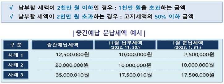 중간예납세액이 1,000만원을 초과하는 경우에는 별도 신청이 필요하지 않으며, 아래 금액을 2023년 1월 31일(화)까지 분할납부가 ​​가능합니다.
