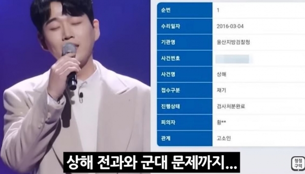 황영웅에게 폭행을 당했다고 주장하는 A씨는 과거 자신의 생일에 생일파티를 열어 술자리로 나뉘고 비술자리가 되는 상황에서 싸움을 벌였다. 병원으로 옮겨져 치료를 받았는데 아직 치아가 남아있다고 하더군요. 그러면서 과거 폭행과 문신 논란을 일으킨 황영웅은 사람들에게 사랑받을 자격이 없다고 밝혔다.