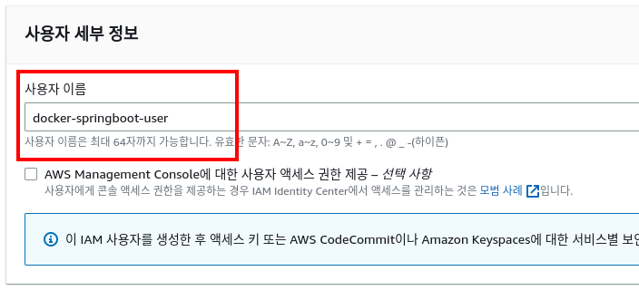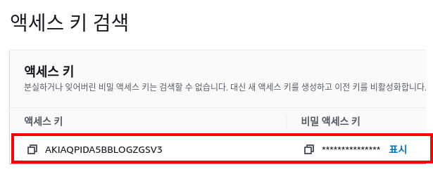 나머지는 기본값으로 설정하고 액세스 키를 발급합니다. 액세스 키는 한 번만 조회할 수 있으므로 다른 곳에 저장해야 합니다.