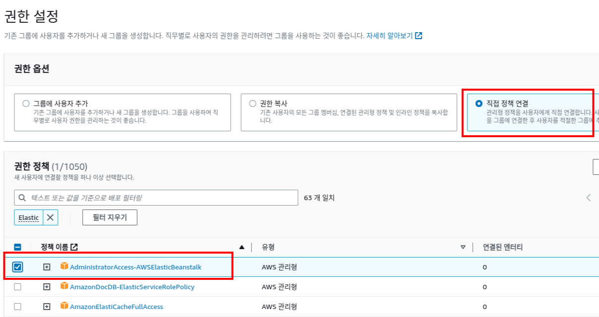 정책 직접 연결을 클릭하여 Elastic BeanStalk를 제어한 후 AdministratorAccess-AWSElasticBeanstalk 허용하다