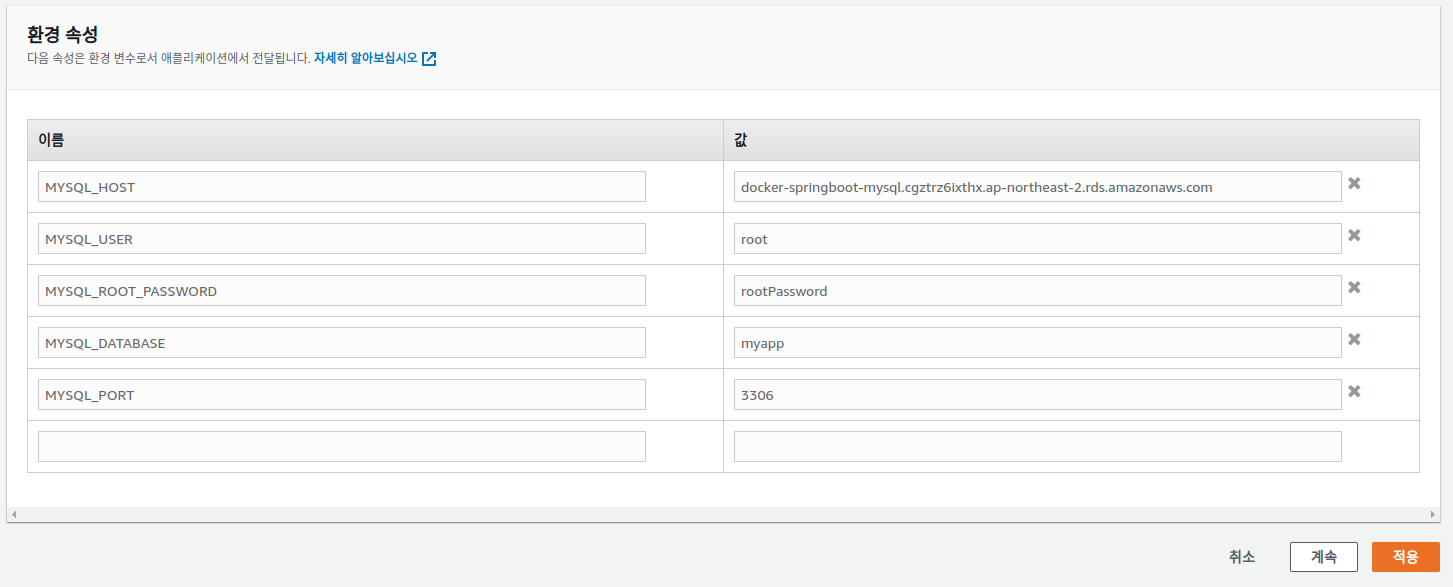 환경 속성에 RDS 환경 변수를 입력해야 합니다. MYSQL_HOST, MYSQL_USER, MYSQL_ROOT_PASSWORD, MYSQL_DATABASE, MYSQL_PORT