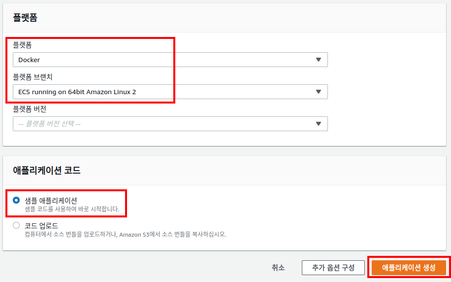 여러 컨테이너가 있는 환경(Nginx, 스프링 부트) 플랫폼 브랜치로 “64비트 Amazon Linux2에서 실행되는 ECS”를 선택해야 합니다.