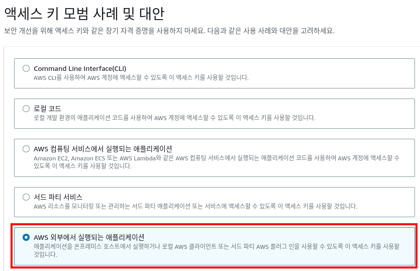 (IAM 사용자 보안 자격 증명 – 액세스 키 생성) 다음과 같이 선택합니다.